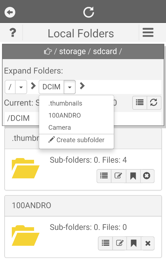 File system navigation is accomplished inside the area under the "Expand Folders", which is called current navigation path, starting at the local root node. The button for each node is used to open the list of all child nodes of the node on its left. One can select one of the child nodes listed to modify or add the node to the current navigation path. For example, if one tap the "100ANDRO" folder inside option popup in the sample snapshot shown here, the "Camera" node in the current navigation path will be replaced by the "100ANDRO" node. Tap on any node inside the current navigation path will select it as the current node with the child folders under folder selected in the list view below. The relative path (to the local root) of the current selected folder is shown under the "Current" area, which, for the sample view, is "/DCIM".