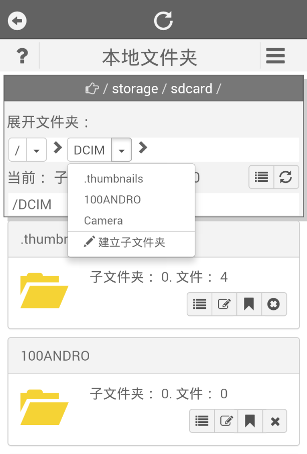 文件系统浏览是在“展开文件夹”下的区域中完成,区域中的内容被称为当前导航路径。它始于局域根文件夹 节点。每个节点左侧的 按钮可被用来打开该节点所有子文件夹列表。用户可以从中选择一个来改变或者添加到当前导航路径。例如,如果用户轻点所示截图中弹出窗口中的“100ANDRO”文件夹,则当前导航路径中的“Camera”节点就会被替换为“100ANDRO”节点。轻点当前导航路径中任何一个一个节点将其选为当前节点,这时其所包含的子文件夹列表就会在下面展示出来。当前选择文件夹的相对路径(相对于局域根目录)在“当前”区域下显示。例如对于所示截图,它是“/DCIM”。