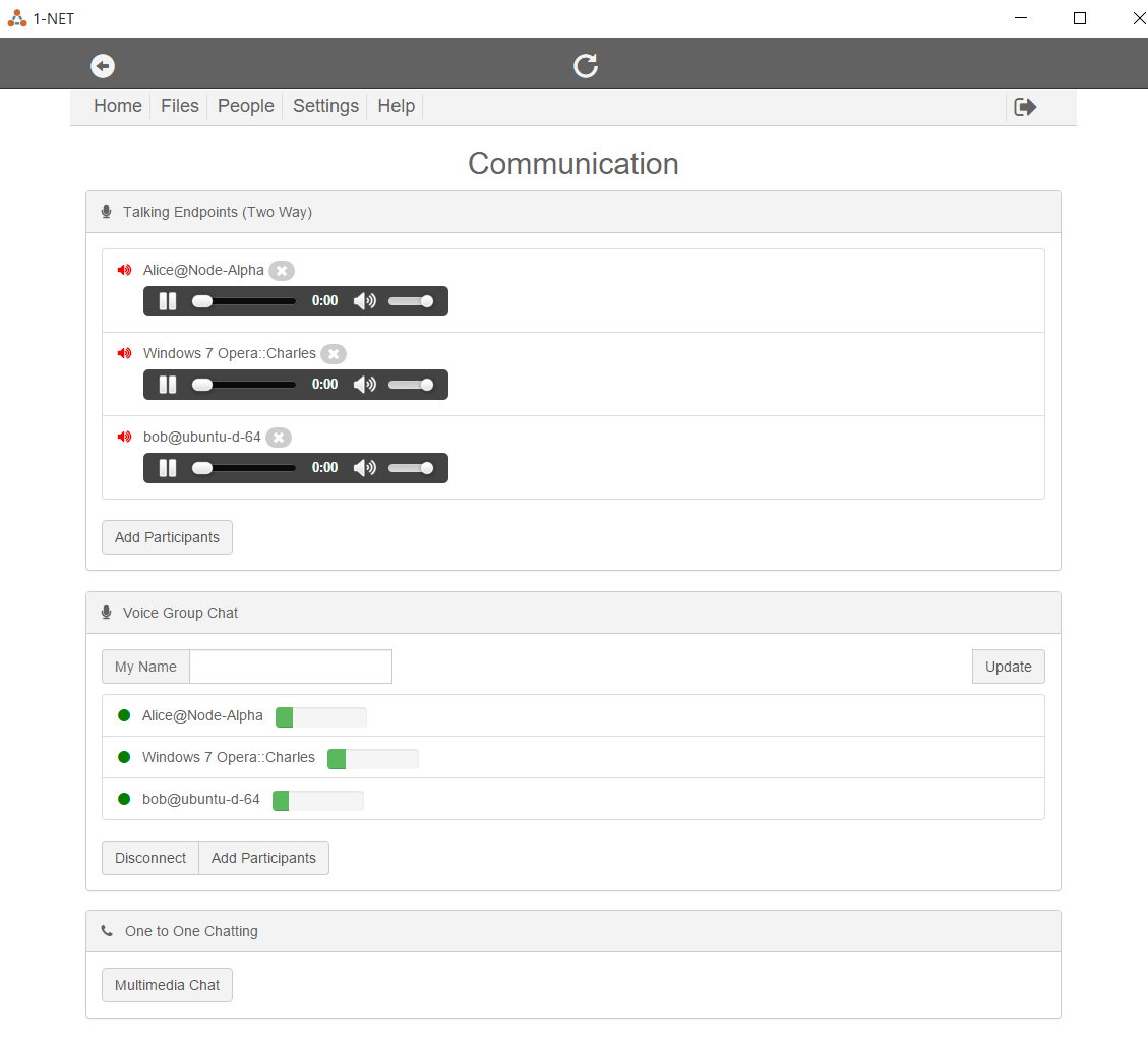 Initiate, manage and participate group voice meeting here. Remote participants of the meeting and their status are shown. The green bar on the right hand side of each active participant represents the (relative) voice strength of the participant, which can be used to indicate who is currently talking.