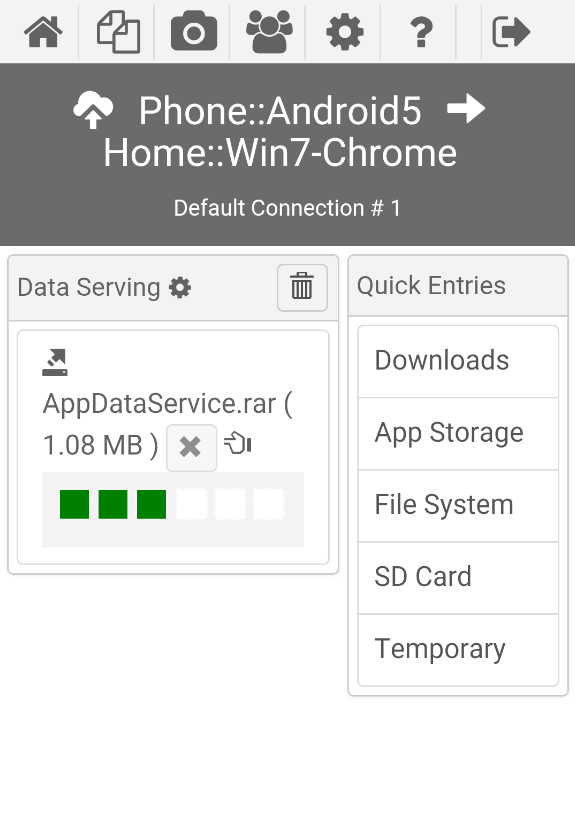 The left side contains a list of serving (or outgoing) data items. The right side contains a list of file system entry points each of which provides a starting folder for file browsing and selection using the file browser of 1-NET.